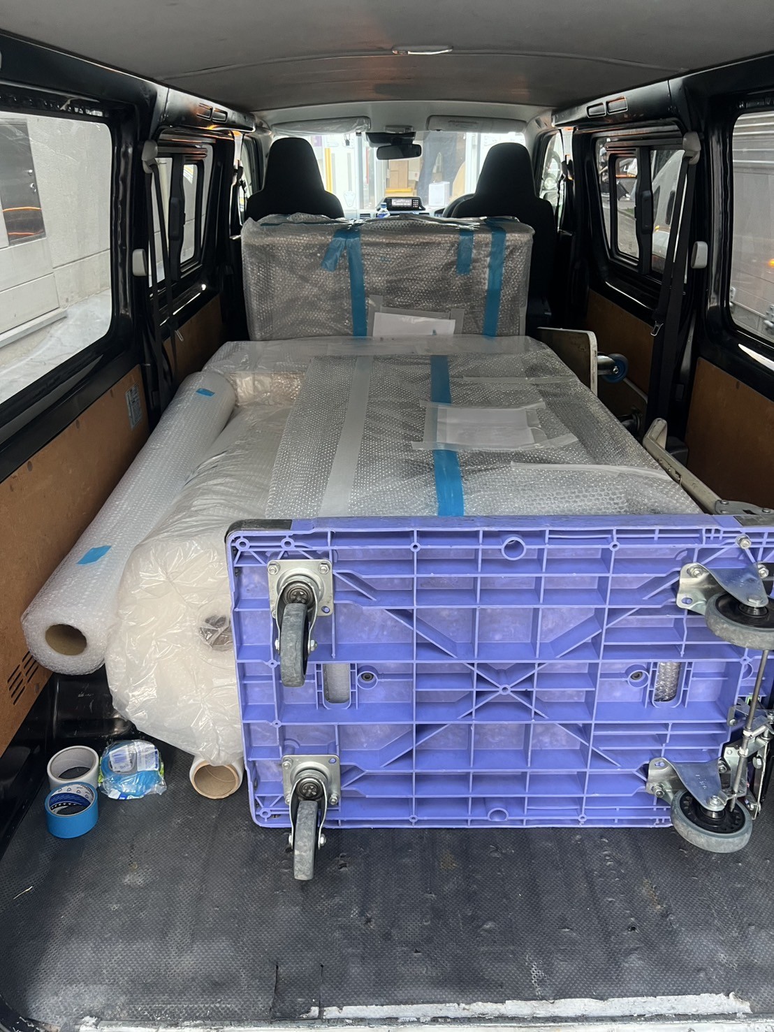 今回は初めてご依頼をいただきました。機器の什器が多く、お問い合わせ時から、運送中に荷崩れの心配をされておりました。写真のようにお荷物をトラックにしっかり固定することができることに、お客様もとても驚かれておりました!次の案件のお約束もいただきました。次回もよろしくお願いいたします!