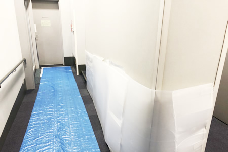 大型の機材や重量物、数量が多い、梱包資材がない、館内の棚に設置、○○さんに手渡し、イベントの搬入出・設営・片付けなども、ワークオンクリエイトがトータルサポートいたします! - 動線の養生 お荷物の搬入出時には、動線に養生をしなければならないことがあります。